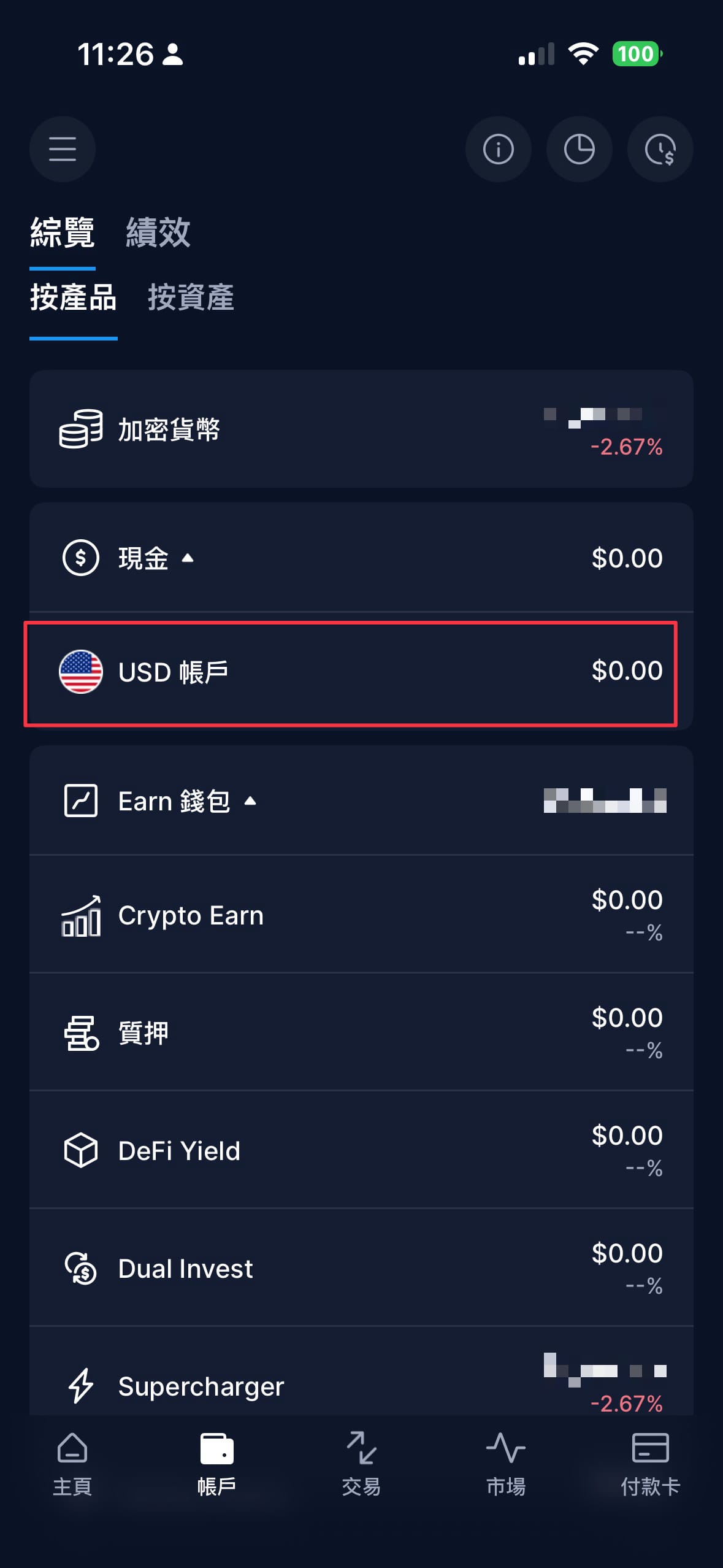 - 到 App 內的「帳戶」選單,選擇「現金」裡面的「USD 帳戶」,然後按「存款」取得存款資訊。
