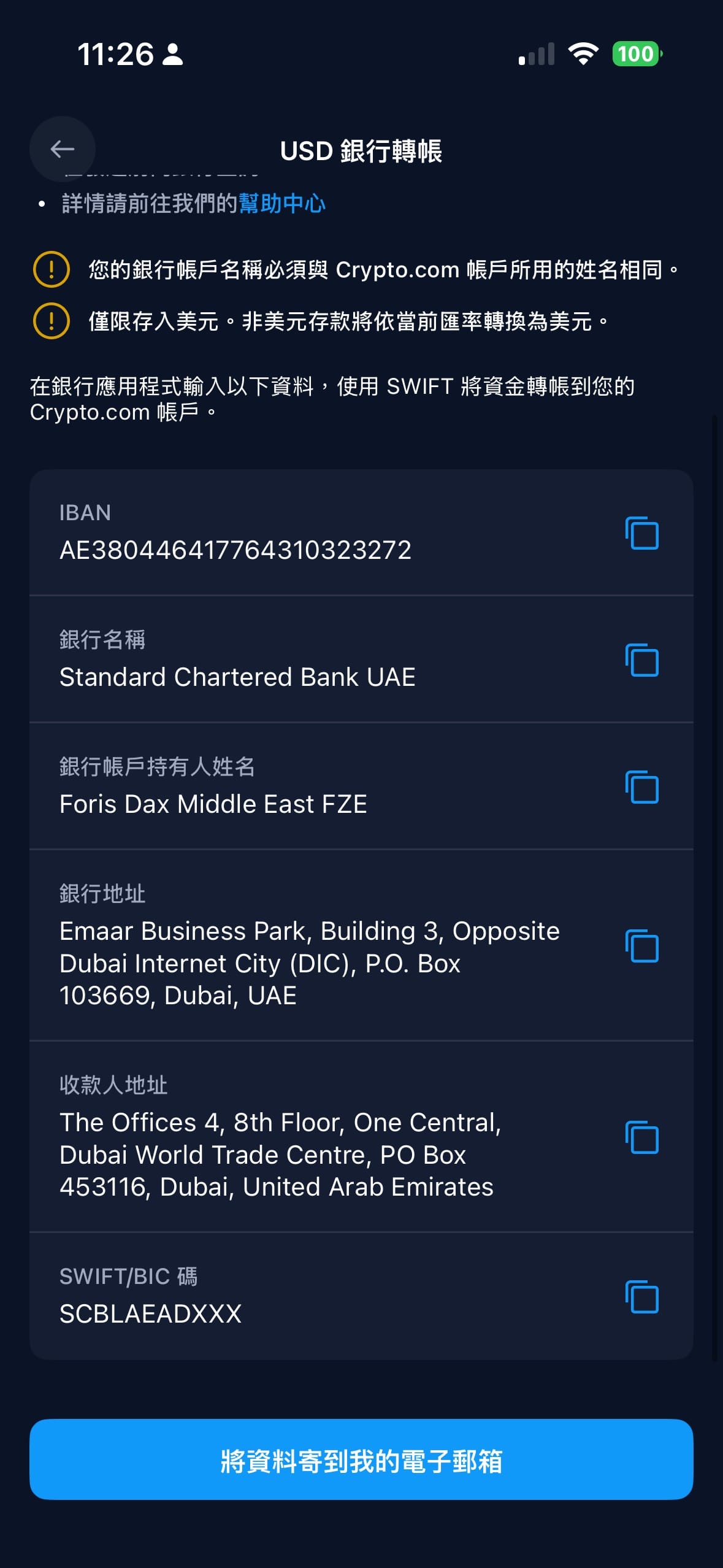 上面都沒問題之後,就可以開始到 Crypto.com 中取得匯款資訊並且匯款啦!